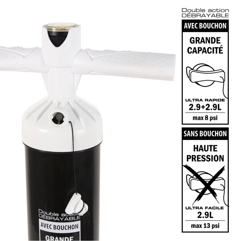 Elle fonctionne au choix en double action (pour plus de volume d’air) ou en simple action (pour plus de pression); Le changement se fait simplement par un bouton sur la pompe.
